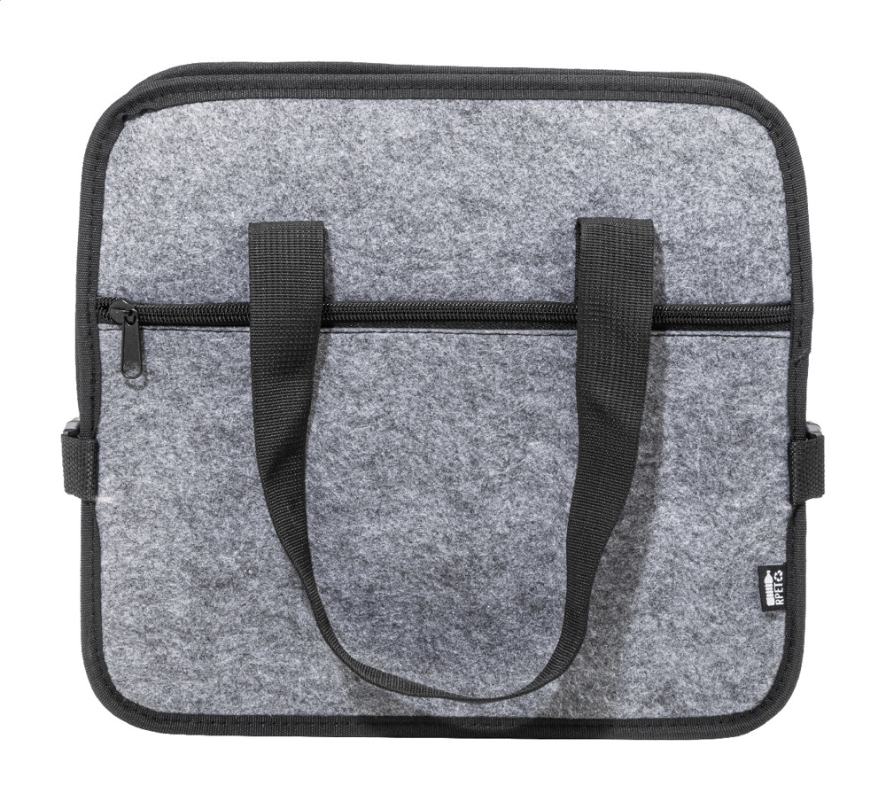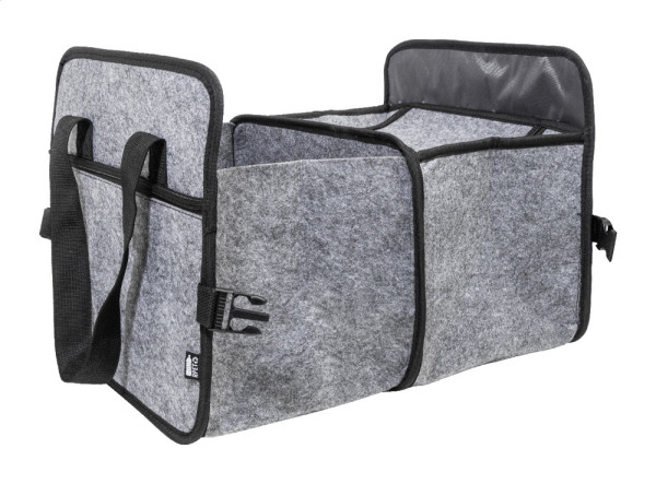 Faltbarer Kofferraumorganizer aus RPET-Filz mit Reißverschluss-Fronttasche, langen Griffen und seitlichen Schnallen für bequeme Aufbewahrung. Mit einem offenen Staufach und einem Kühlfach mit Reißverschluss und Aluminiumisolierung. Mit RPET-Label.