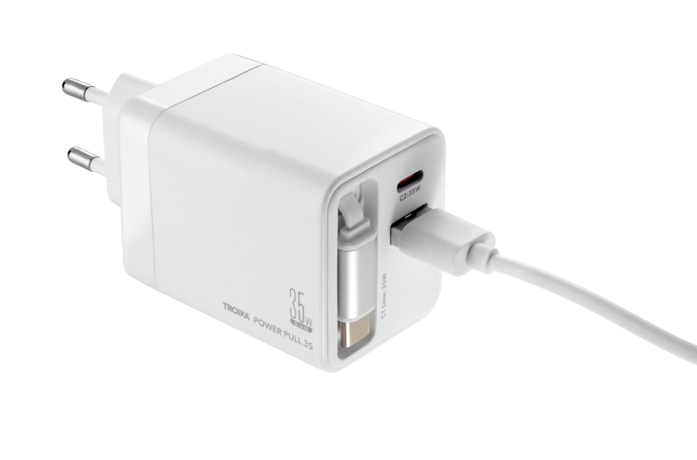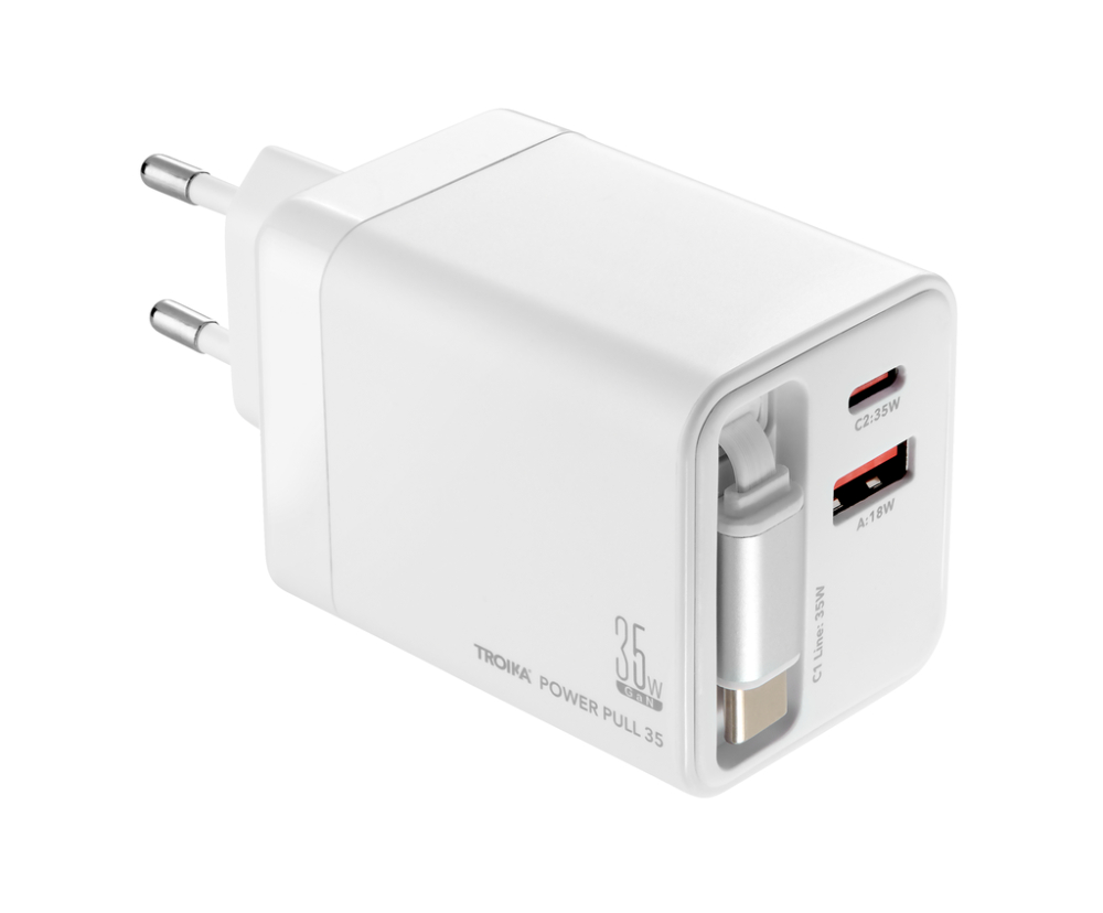 Ladestecker mit GaN- und Schnellladetechnologie Power Delivery, 35W mit USB-C und USB-A Anschluss sowie ausziehbarem USB-C Kabel (Länge 70cm), zum gleichzeitigen Laden von mehreren Geräten, Kunststoff, weiß