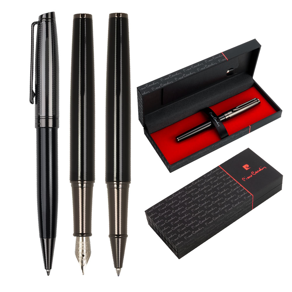 Pierre Cardin Luxus-Schreibgeräte in elegantem Design. Die Stiftgehäuse sind in glänzendem Schwarz gehalten, die strukturierten Oberteile in Gunmetal. Der Kugelschreiber hat einen Drehmechanismus, die Spitze des Rollers ist durch eine Kappe geschützt. Der Rollerball enthält eine deutsche Schmidt-Patrone in Blau mit 0,6 mm Spitze, der Kugelschreiber eine blaue Qualitätsmine mit 1 mm Spitze und der Füllfederhalter eine blaue Standardpatrone. Rollerball und Kugelschreiber werden mit einer schwarzen Ersatzmine geliefert. Verpackt in einer Pierre Cardin Luxus Box, versendet mit Echtheitszertifikat.