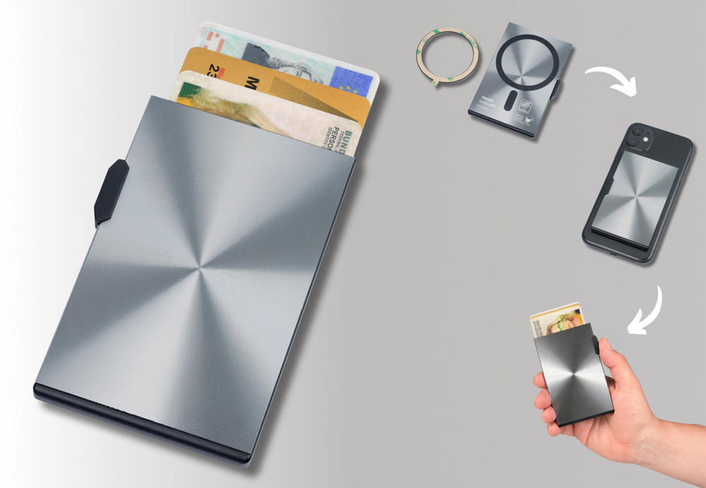 Kartenetui MagSafe, Etui für bis zu drei Karten (Führerschein, Ausweis, Kreditkarte), mit Schiebemechanismus, Magnet (N52) auf der Rückseite zum Befestigen am iPhone, zusätzlicher selbstklebender MagSafe Metallring mit 3M Klebefläche zur individuellen Befestigung, z.B. an allen gängigen Smartphones, Hüllen, Notizbüchern, etc., RFID Schutz (Auslesesicherheit), Aluminium, Diamantschliff, titanfarben